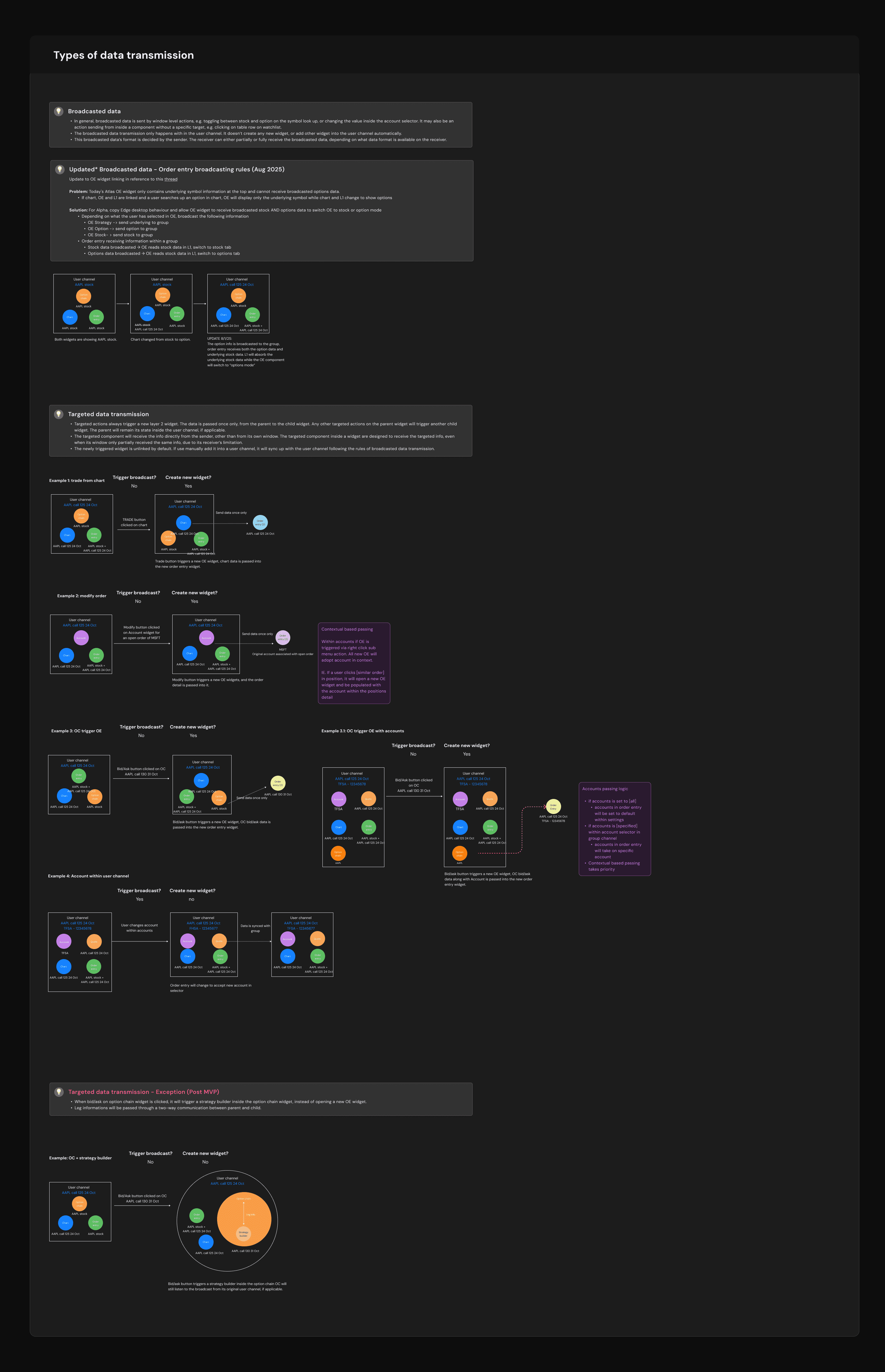 The Problem: Users expect "smart" connectivity across the workspace, but their behaviour changes based on their mental model. For example, clicking a symbol to browse should update a linked Quote widget, but clicking a price to take action should trigger a contextual Order Entry panel. These context-shifting behaviours were flagged by Dev as high-complexity, resource-heavy customizations.